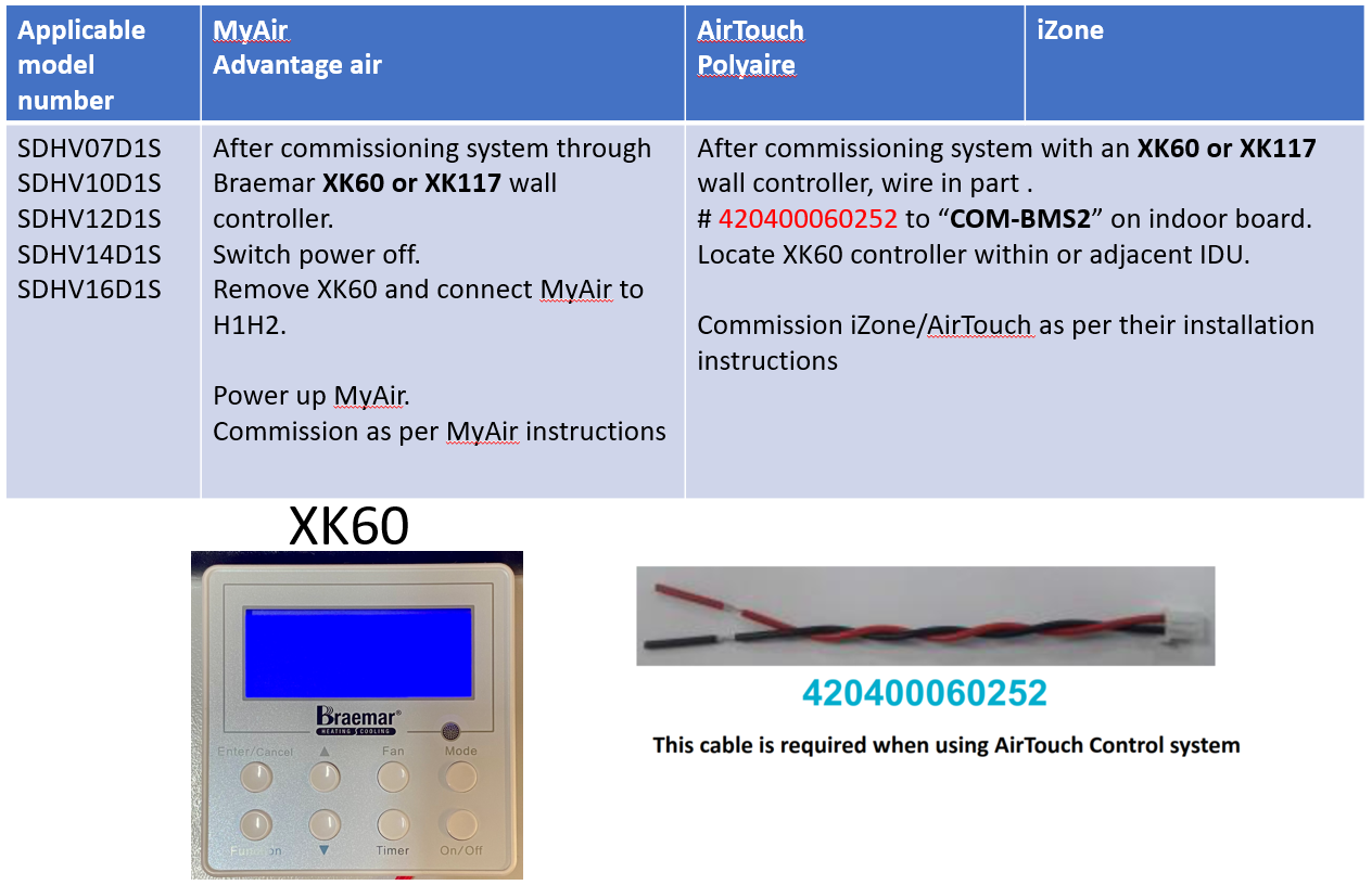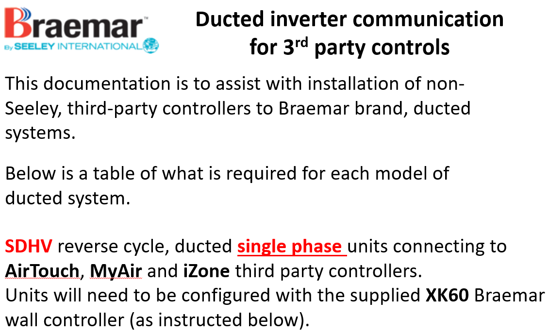 SDHV ducted single phase - 3rd party controls (AirTouch MyAir and iZone) communication for ducted inverter