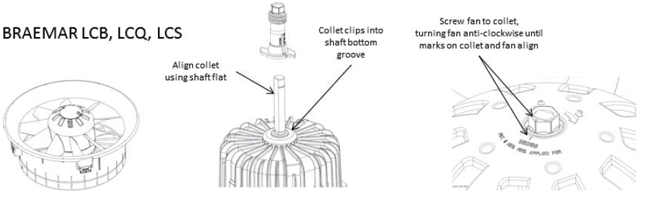 | LCB, LCQ, LCS | Collet | Clip collet → Align shaft flat → Screw fan anti‑clockwise |
